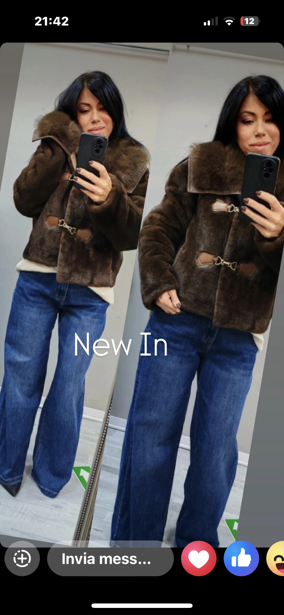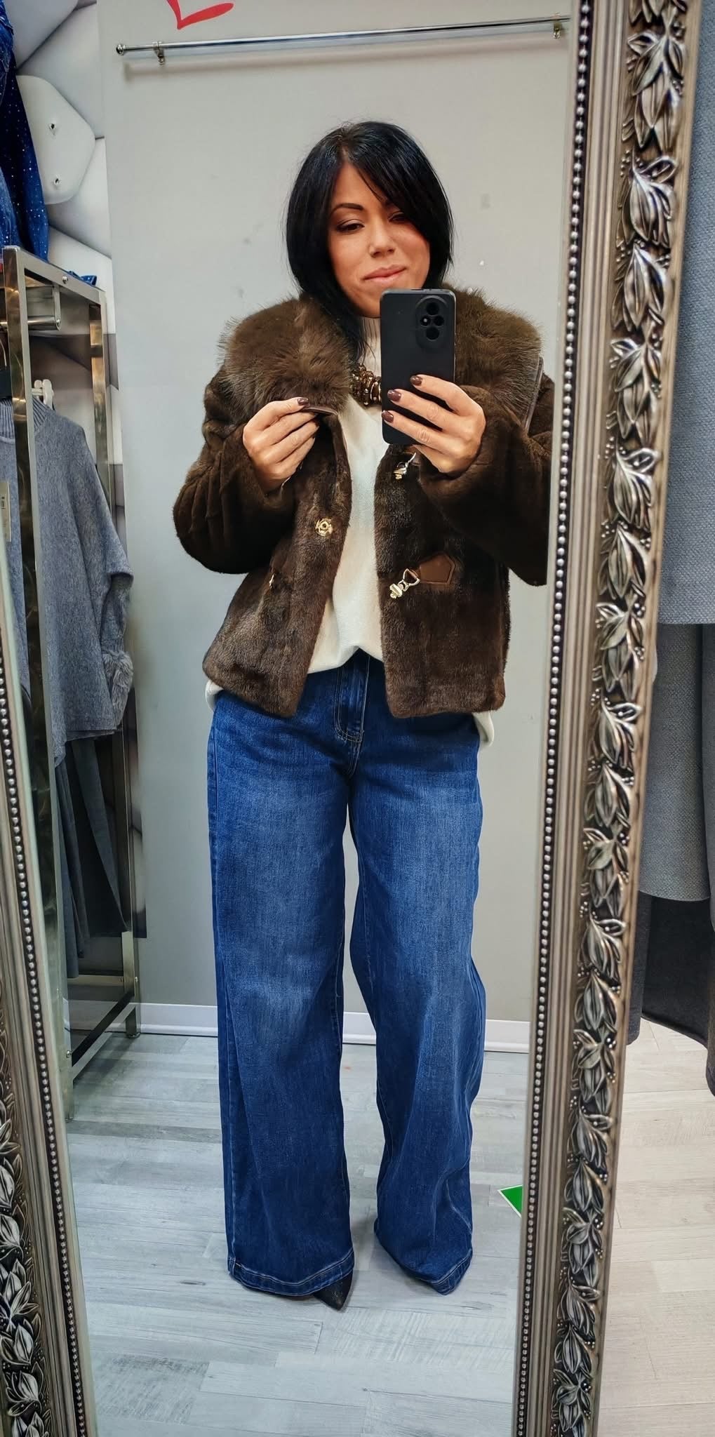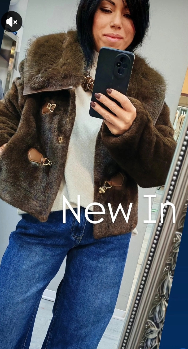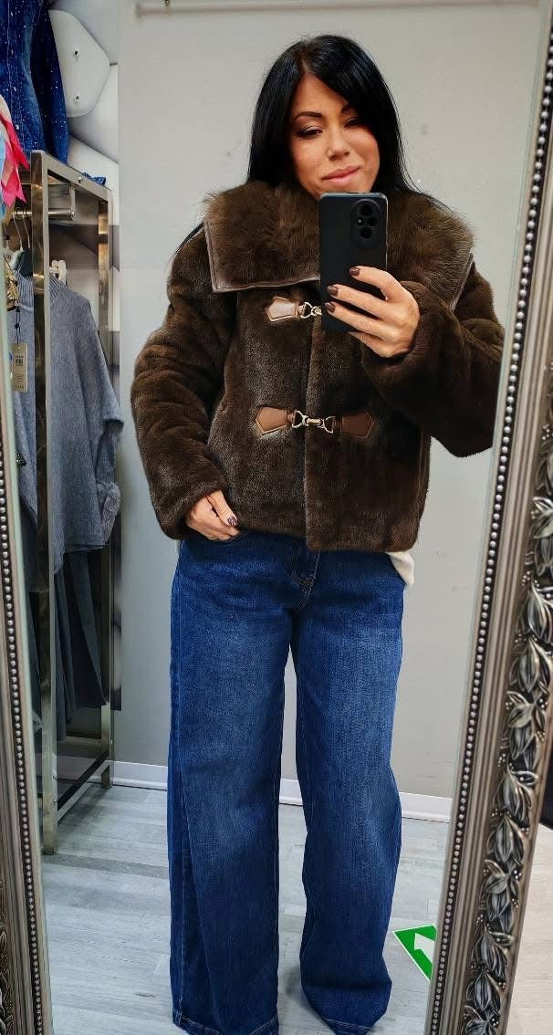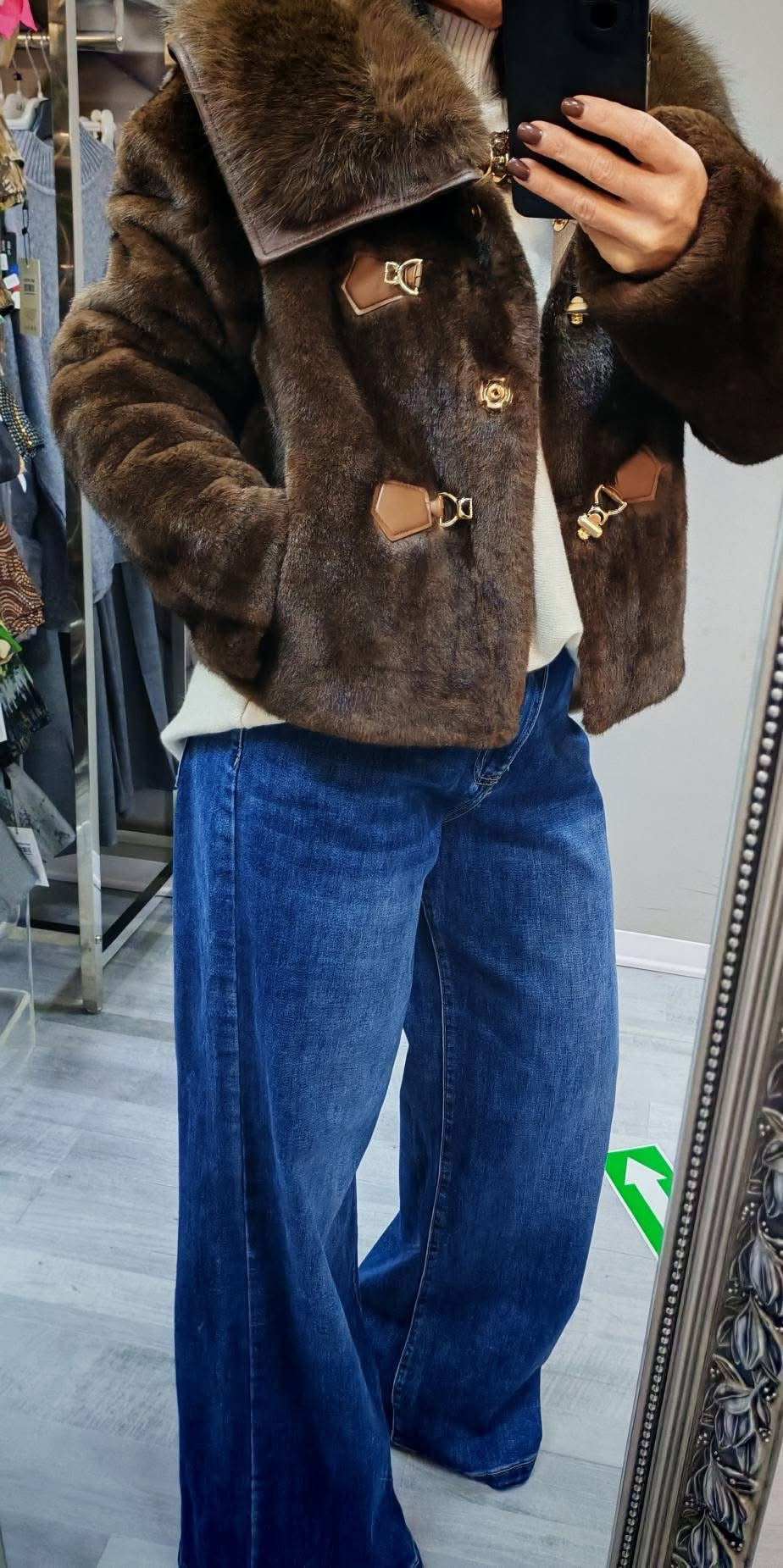 Pelliccia marrone scuro, caratterizzata da un collo ampio e chiusure a alamari/ganci